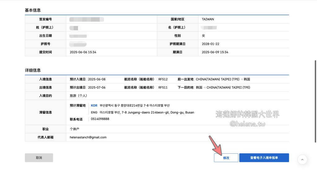 實測發現,「修改」的功能,無法修改入境日期